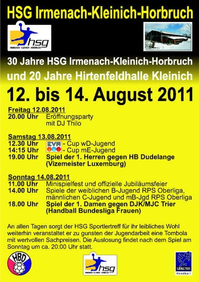 Die HSG Irmenach-Kleinich-Horbruch feiert ihr 30. jähriges Bestehen und gleichzeitig 20 Jahre Hirtenfeldhalle Kleinich vom 12. bis 14. August 2011.
