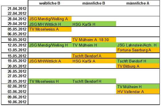 Wir sind sehr froh, dass es uns gelungen ist die Heimspiele von immer mindestens 2 Mannschaften zusammenzulegen. Ein besonderes Highlight dürfte dann der Heimspieltag am 12.05.2012 sein, an dem alle drei Jugendmannschaften in eigener Halle nacheinander antreten.