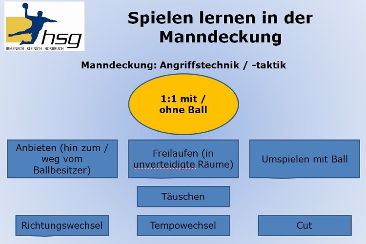 Am kommenden Samstag, 21.11.15, findet von 14:00 bis 16:00 in der Hirtenfeldhalle Kleinich eine interne Trainerfortbildung der HSG Irmenach / Kleinich / Horbruch statt. Die Veranstaltung steht unter dem Leitthema "Spielen lernen in der Manndeckung". Mit dem Mini A-Team wird es dann vor allem um das Prellen gehen.
