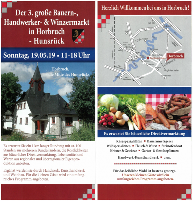 Am Sonntag den 19.05.2019 von 11 bis 18 Uhr findet wieder unser alljährlicher Bauern-, Handwerker und Winzermarkt statt. Wie jedes Jahr erwartet Sie ein reges Markttreiben in den Straßen von Horbruch mit Angeboten aus dem Kunsthandwerk, der Direktvermarktung von Lebensmitteln und Waren aus regionaler Produktion. Auch für das leibliche Wohl ist gesorgt.