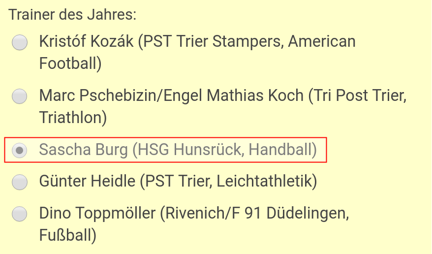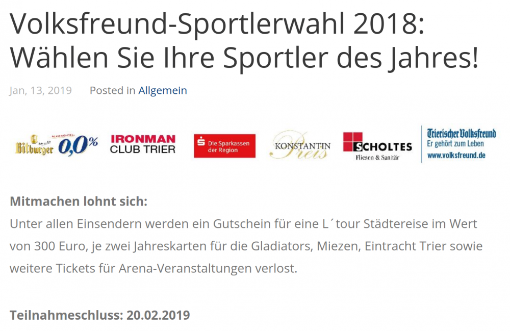 Unter dem Link https://mitmachen.volksfreund.de/tv-sportlerwahl/ gelangt ihr auf die Homepage zur Abstimmung. Hier einfach bei Sascha unter der Rubrik „Trainer des Jahres“ klicken und wenige Zusatzdaten ausfüllen. Eine Einwilligung zur Datennutzung muss nicht abgegeben werden.